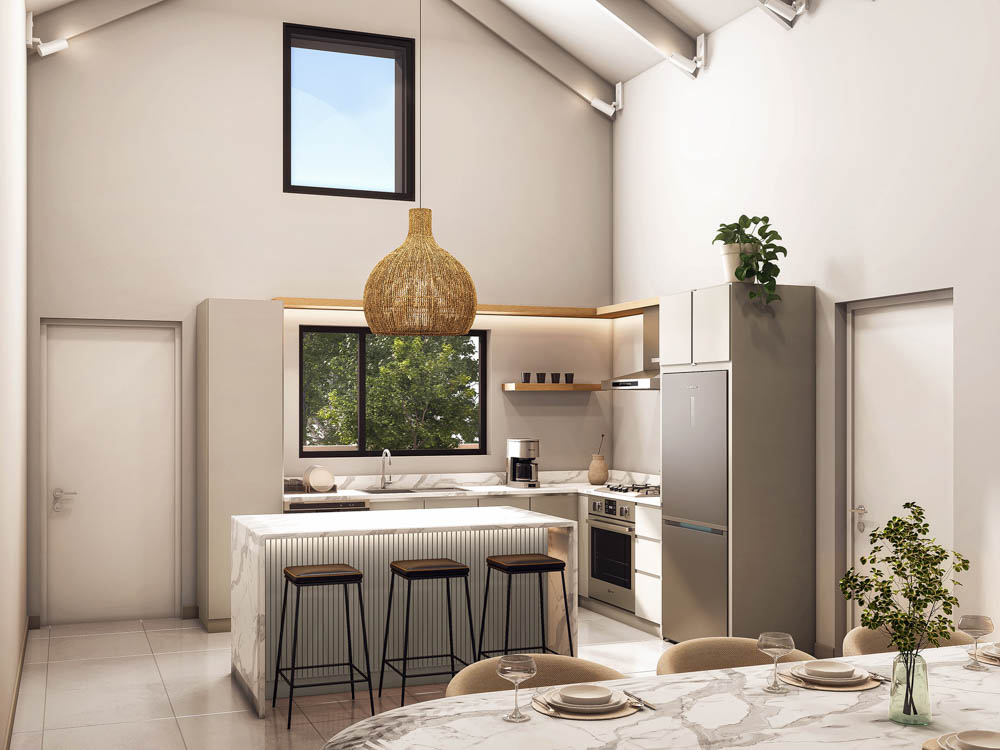Vaulted ceilings, oak accents, and generous built-in storage define the living spaces. Kitchens are functional and tactile, bathrooms are spa-like and minimalist, and bedrooms are designed to feel serene and restful.